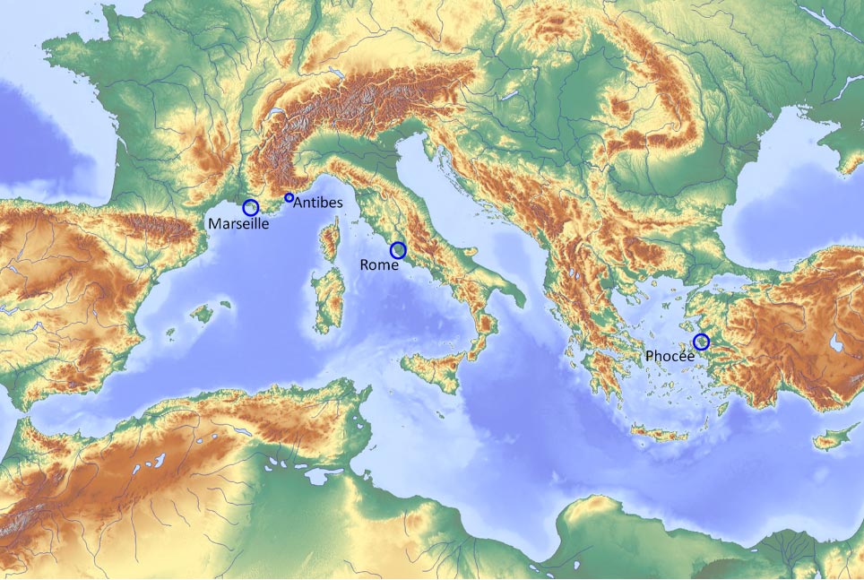 La stèle dite « de l’enfant Septentrion » est documentée depuis le XVIe siècle. La ville moderne d’Antibes, en Provence orientale, s’est développée sur l’ancienne cité grecque d’Antipolis. Les marchands grecs s’étaient établis là vers le IVe siècle av. JC, parmi des tribus autochtones ligures, et la région fut annexée à la République romaine vers 43 av. JC.