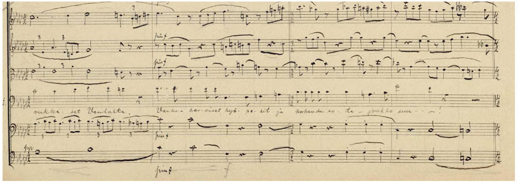 La volonté d’imposer la langue finnoise a été accomplie dans l’opéra Les sept frères (1913) d’Armas Launis. Launis fut le premier compositeur à mettre la langue finnoise au service du récitatif. Le roman d’Aleksis Kivi, paru en 1870, convenait parfaitement à cet objectif. Launis a essayé de suivre le chant parlé très systématiquement : le discours est fluide et les chanteurs doivent chercher une récitation naturelle et un ton populaire, y compris dans les accents des mots et des phrases.